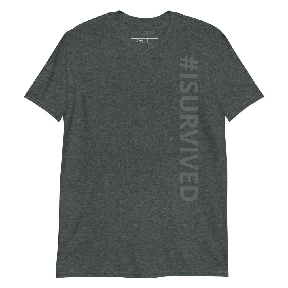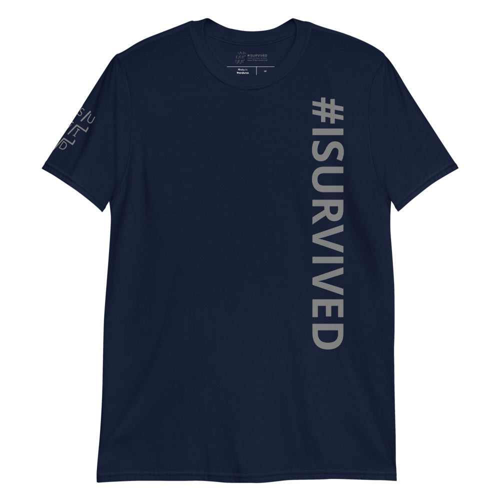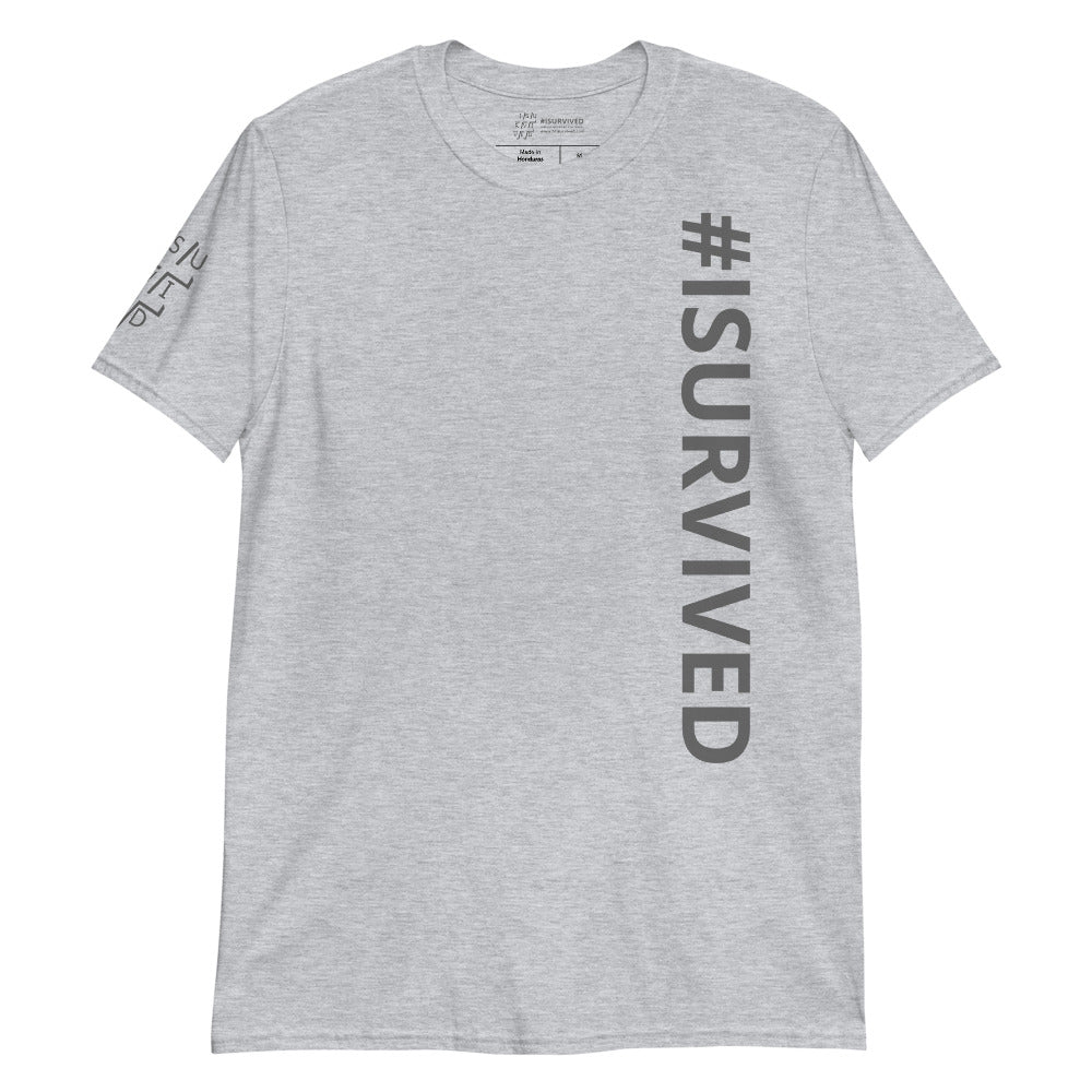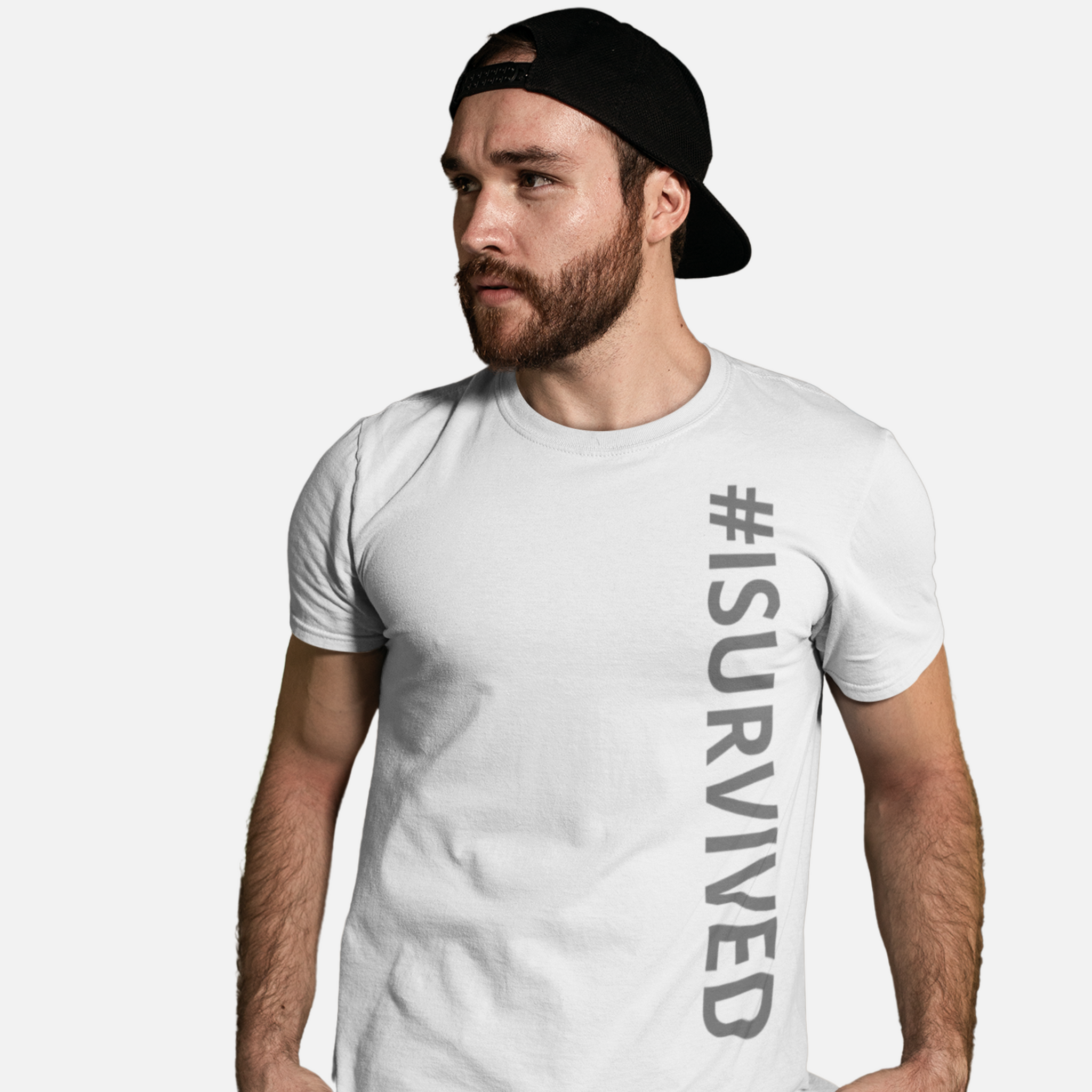 See our plain T-Shirt with the unique slogan '#ISURVIVED' down the chest.